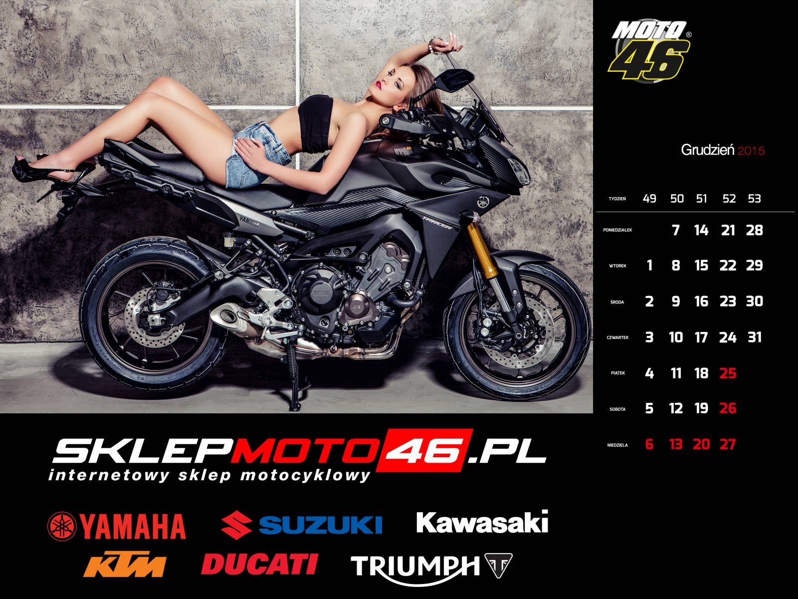 Grudzień to miesiąc Yamahy. Rok 2015 kończymy w pięknym stylu, zjawiskowa Marika na Yamasze MT09 Tracer. Niby to tylko rok, ale naprawdę jest co wspominać! W skrócie – filmowe podsumowanie sesji foto i videograficznej dla sklepmoto46.pl z 2015 roku.