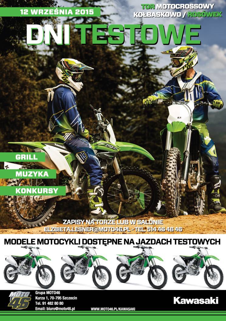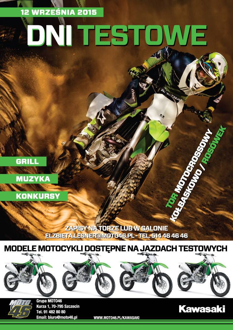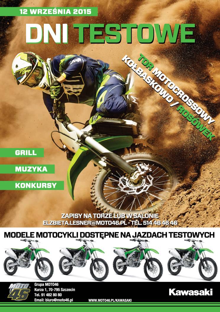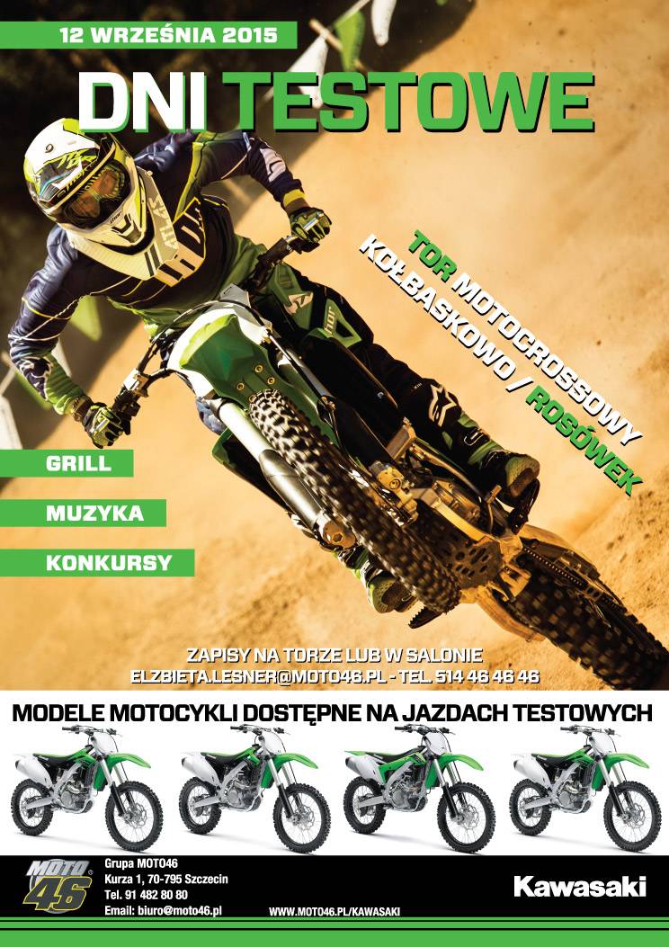 Grupa Moto46 oraz sklepmoto46.pl serdecznie zapraszają na dni otwarte marki Kawasaki, które odbędą się 12 Września 2015. Przez cały dzień udostępniamy dla Was najnowsze modele Kawasaki 2015 na torze motocrossowym Kołbaskowo / Rosówek!